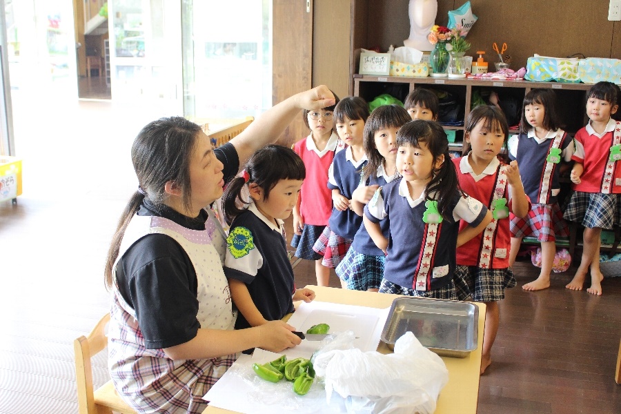7月3日(水)、愛知学泉大学附属桜井幼稚園の年長さんが収穫祭を行いました。園庭で育てたピーマンやナスなどの夏野菜を使って、みんなで焼きビーフン作りに挑戦!「野菜を持つ手はネコの手だよ」と教えてもらいながら、先生と一緒に包丁で野菜を切っていきます。少し緊張している子もいましたが、みんな上手に切ることができました。