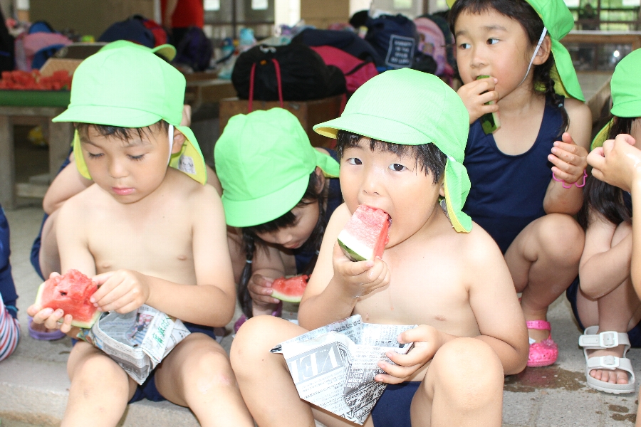 午後は水着に着替えてすいか割りと沢遊びをしました。グループごとに行われたすいか割りは毎年大盛り上がりで「右だよ右!」「せーの!割れた!!」など、あちこちから楽しい声が聞こえてきます。すいかも甘くてとても美味しかったですね☆沢では生き物を見つけたり、お友達と水をかけ合ったりして、涼を感じながら自然を満喫している様子でした。