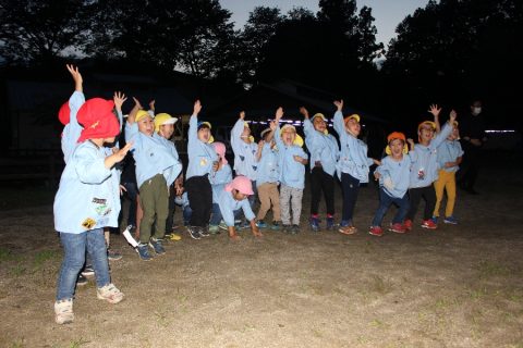 カレーを食べ終えたあとは、いよいよ最後のお楽しみのキャンプファイヤー!火の神様からもらった火が消えるまでゲームをして遊びました。先生による出し物も大盛り上がりでしたね(最後は子どもたちも大好きなTを探す兄弟が登場しました)。