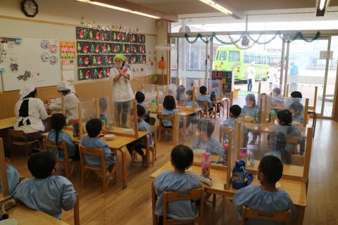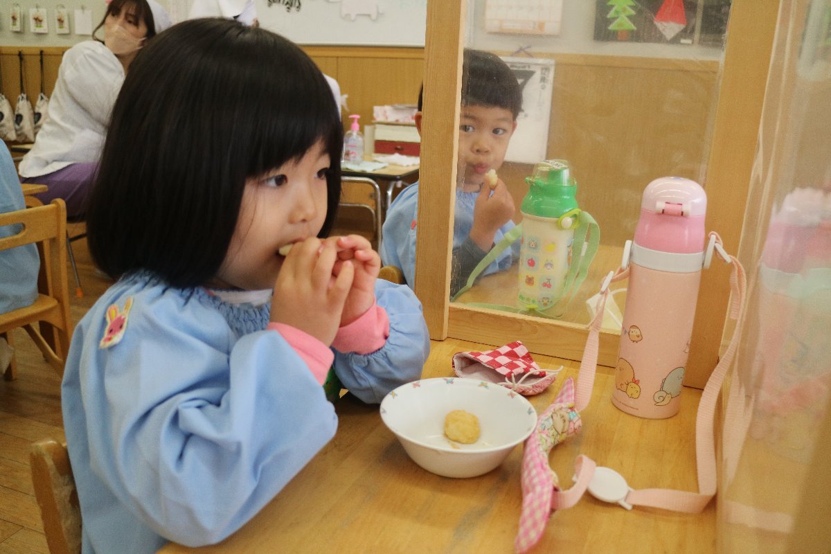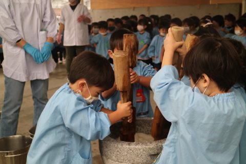 各クラスで、子どもたちはニコニコとっても楽しそうにつきたてのお餅を食べました。みんなお餅好きかな?おかわりする子もたくさん見かけました。みんなが食べ終わるまで、先生と手伝いに来てくれていたお母さんたちがしっかりと見守っていてくれていました。自分たちで頑張ってついたお餅だから、一段と美味しい味だったかな?