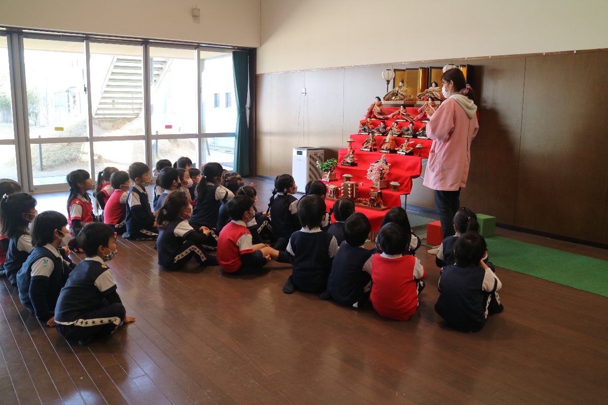 当日はひな祭り。「えほんの森プレゼント会」の前にはひな祭りの由来やひな人形について先生からお話を聞いているクラスがありました。お遊戯室には素敵なひな人形も飾られ、給食はちらし寿司やお吸い物などの「ひな祭り給食」を食べ、ひな祭りを楽しみました。