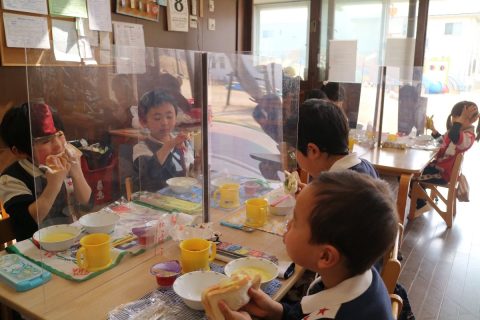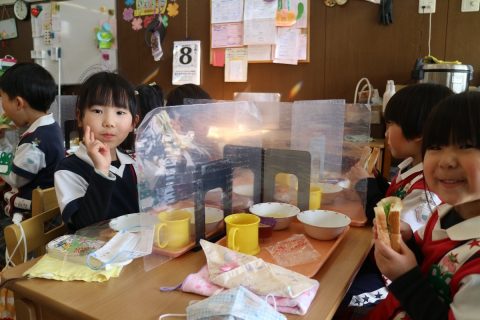 おまけ☆ この日の給食はサンドイッチでした。パンにハム、チーズ、レタスを自分ではさんでサンドイッチを作りました。みんな上手に作っていました。 ※写真は年少さん、年長さんクラスです。