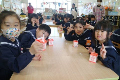 11月29日(金)、愛知学泉短期大学附属幼稚園で食育教室が行われました。いつも飲んでいる牛乳を作っている協同乳業株式会社の方が来園し、牛乳についてのお話の読み聞かせやクイズをしていただきました。牛乳について学んだあとは牛乳とお土産をいただきました。心も体も栄養たっぷりな食育教室でした。