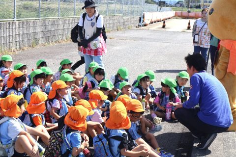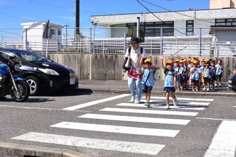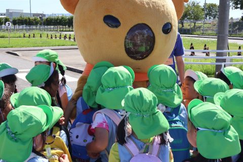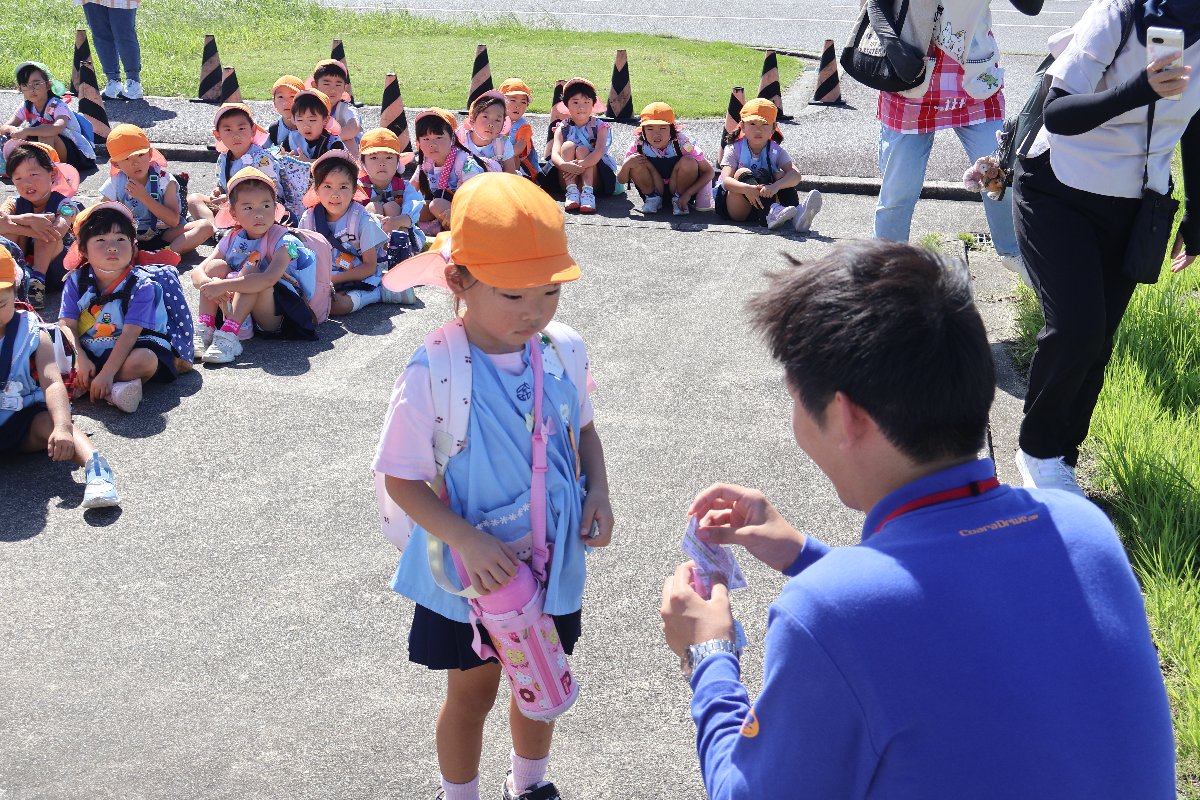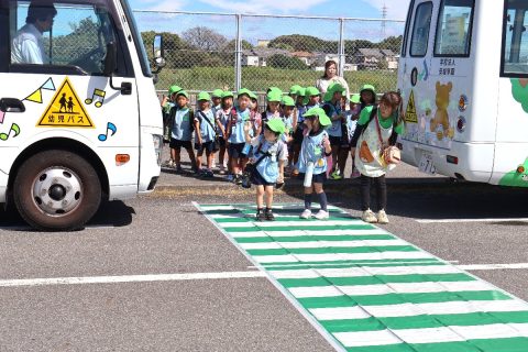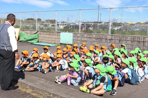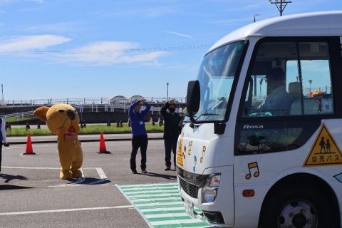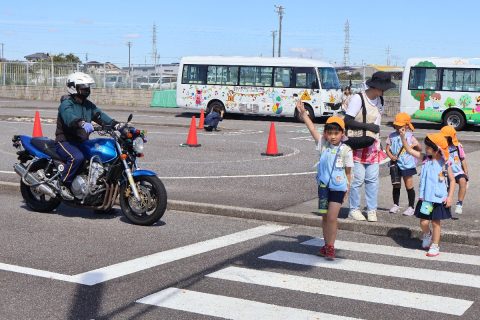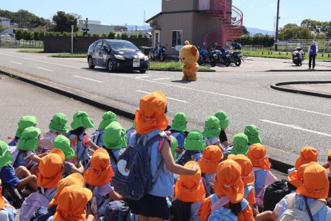 10月6日(月)、愛知学泉短期大学附属幼稚園の年長さんがコアラドライブ安城にて、横断歩道の渡り方を学びました。マスコットキャラクターのジョーくんが登場し、危ないシーンを再現。どこがダメだったかな?どうすればいいのかな?と園児たちも考えます。そのあとは実際にバイクが走る教習所内の横断歩道を渡ってみました。しっかりと確認をし、よく見て安全に渡ることができました。