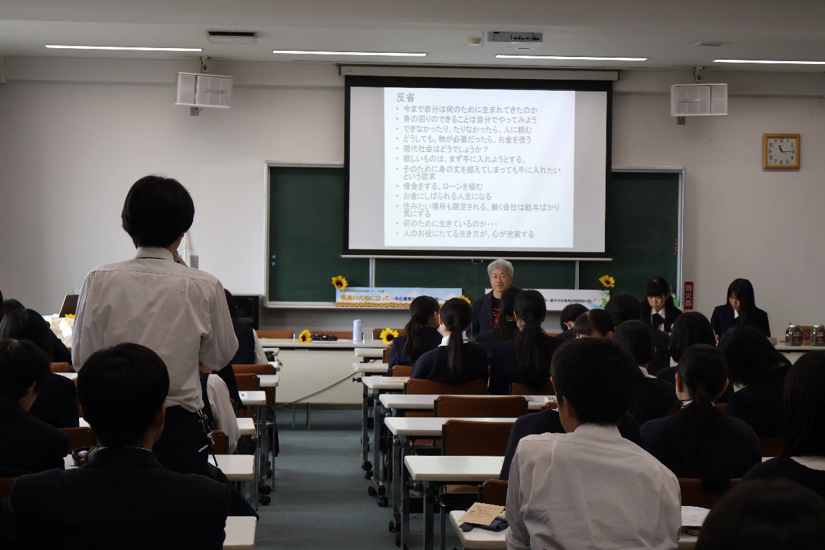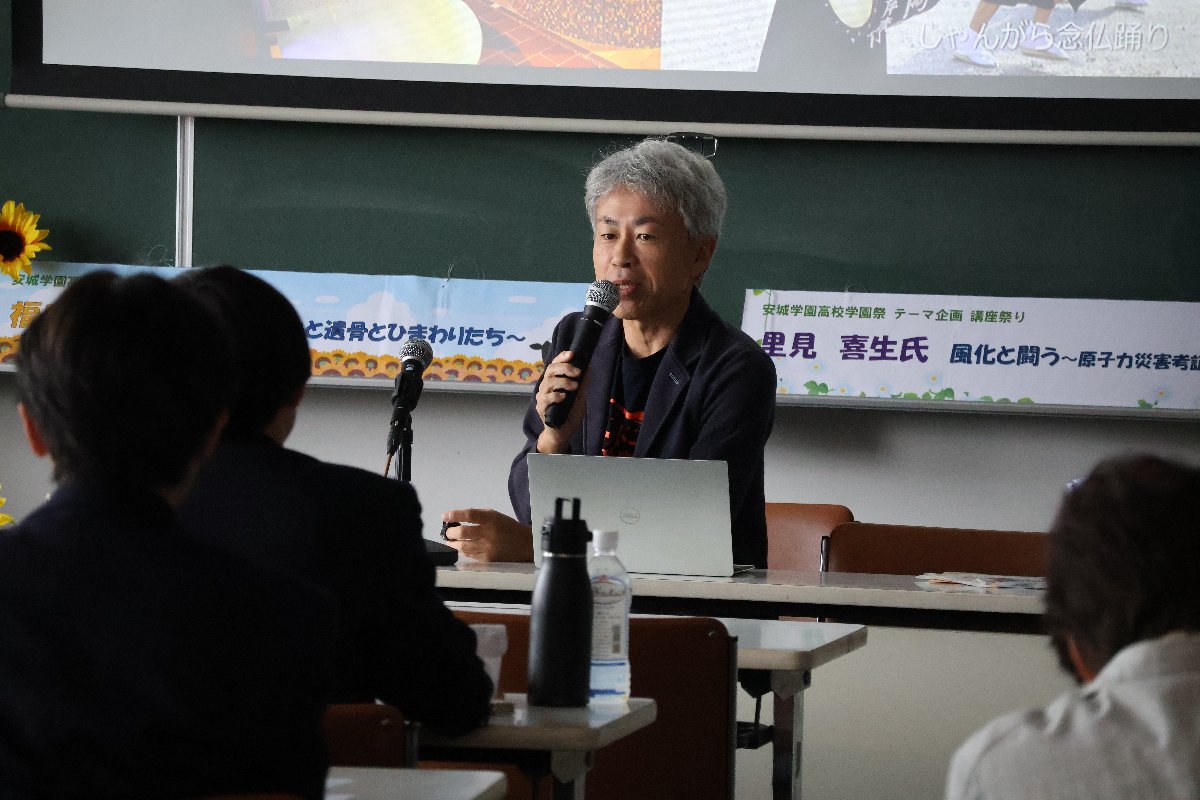 また、このツアーのご縁から、10月26日(日)には同校で行われた「ふれ愛ときめき西三河フェスティバル」にて、 訪問先の一つである「原子力災害考証館furusato」館主 里見喜生氏を講師としてお招きし、「風化と闘う ~原子力災害考証館開設の思い」と題した講演会を開催。講演後は参加した生徒たちからの感想や質問に対し、里見氏がひとつひとつ丁寧に返答され、生徒たちも真剣に耳を傾けていました。
