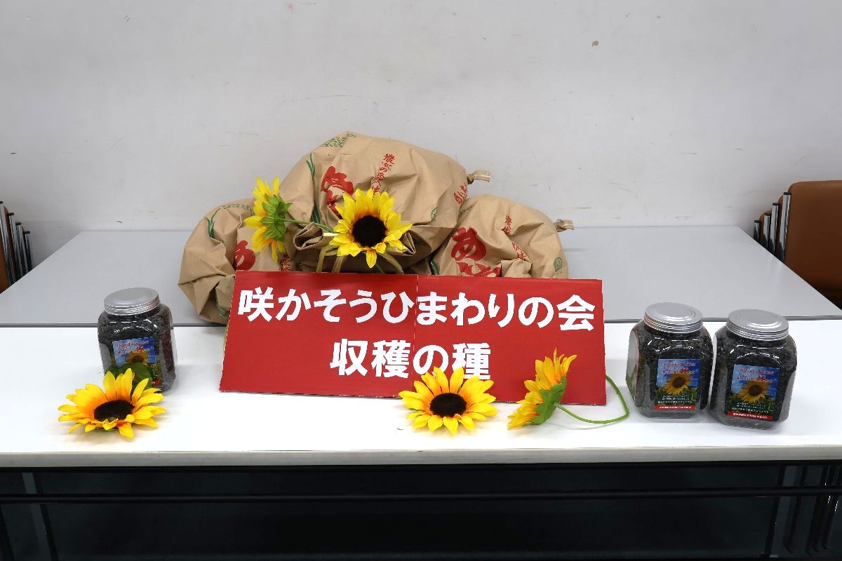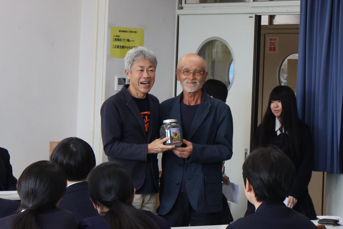 安城学園高校と福島県とは「福島ひまわり里親プロジェクト」とのご縁も長く、講演会後には、このプロジェクトに賛同し、ご協力いただいている、「咲かそうひまわりの会」の河原代表から里見氏へ、今年収穫されたひまわりの種の贈呈式も行われました。(予定されていた種を付けたバルーンリリースは、雨天のため中止となりました)