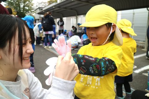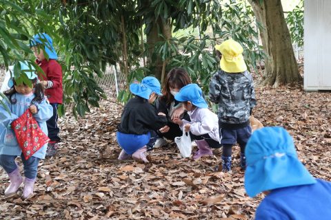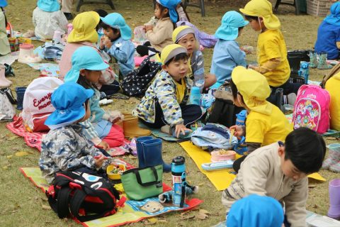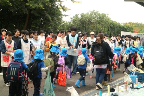 園児たちはこの後、キャンパス内の芝生でお弁当とおやつを食べ、落ち葉で遊んだり、どんぐりを拾いをしました。たくさんの秋にふれあえた1日でした。