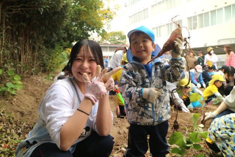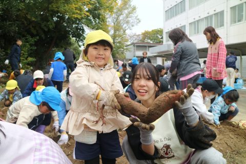 11月13日(水)、愛知学泉短期大学幼児教育学科1年生と愛知学泉短期大学附属幼稚園年中さん、満3歳児さんが、短大のキャンパス内にある畑でいも掘りを楽しみました。このおいもは5月に幼児教育学科の学生と年中さんが一緒に植えたおいもで、今日までの間、学生たちが大切に育ててくれていました。