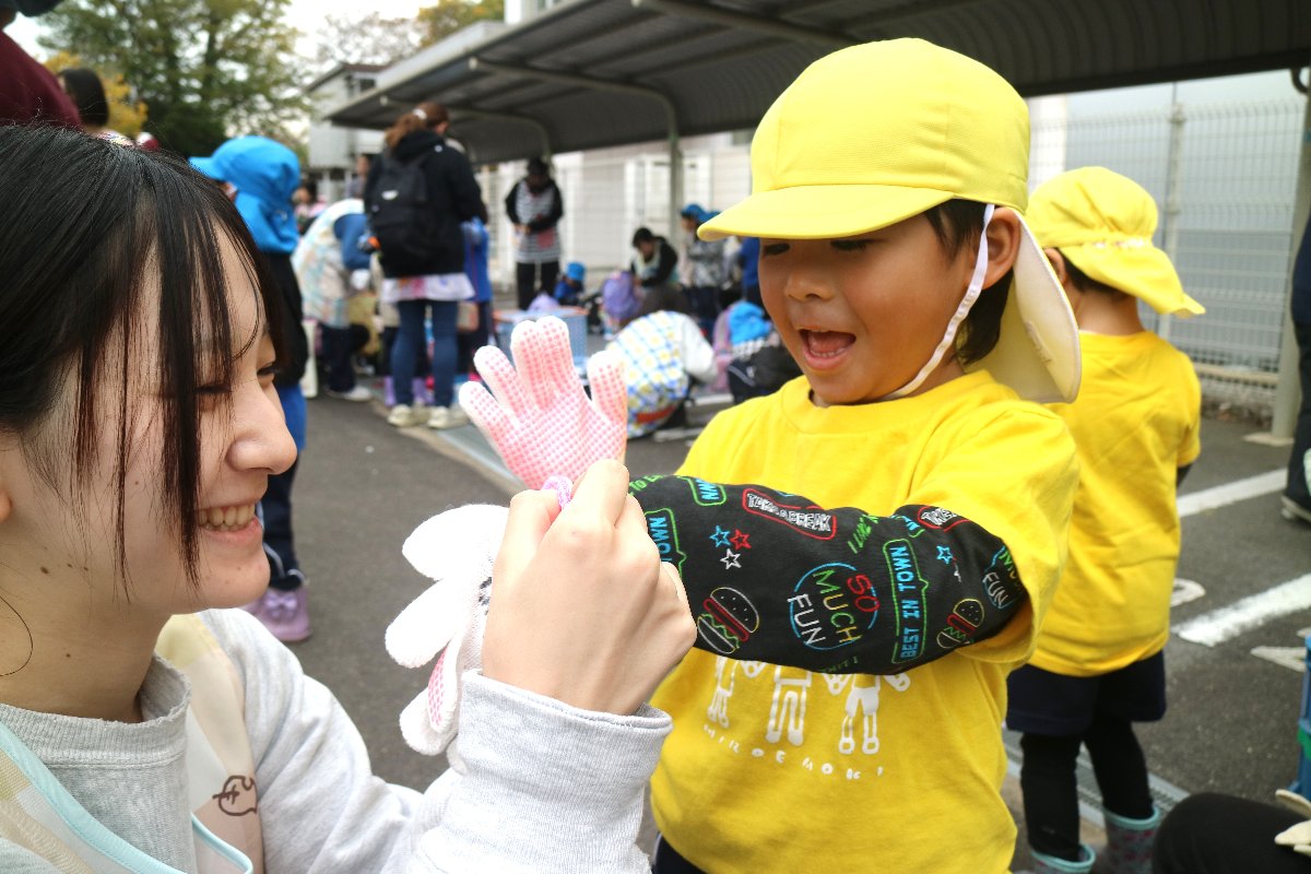 園児に学生がつき、「ここをほってみようか」と一緒にさつまいもの収穫がスタート。アリやダンゴムシを見つけて教えてくれる子や、「こっちにもありそう!」と芋ほりを楽しむ姿がみられました。びっくりするほど大きなおいもも収穫できて、みんなとっても嬉しそうでした!収穫が終わった子から、学生と一緒に片付けや手を洗いに行き、学生一人ひとりがわかりやすく作成したおいもの観察記録を園児たちにプレゼント。学生たちにとっても、子どもとの関わりを通して、保育者としての接し方や支援の仕方を学ぶ貴重なひとときとなりました。