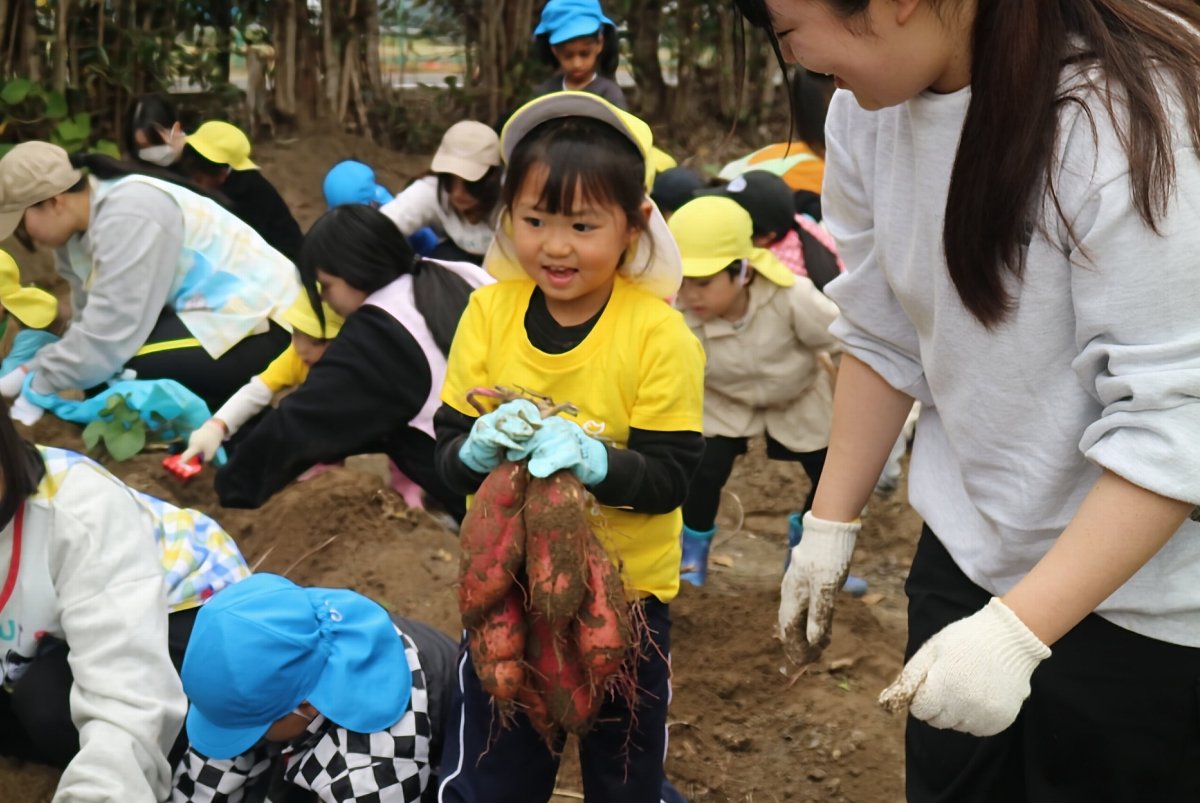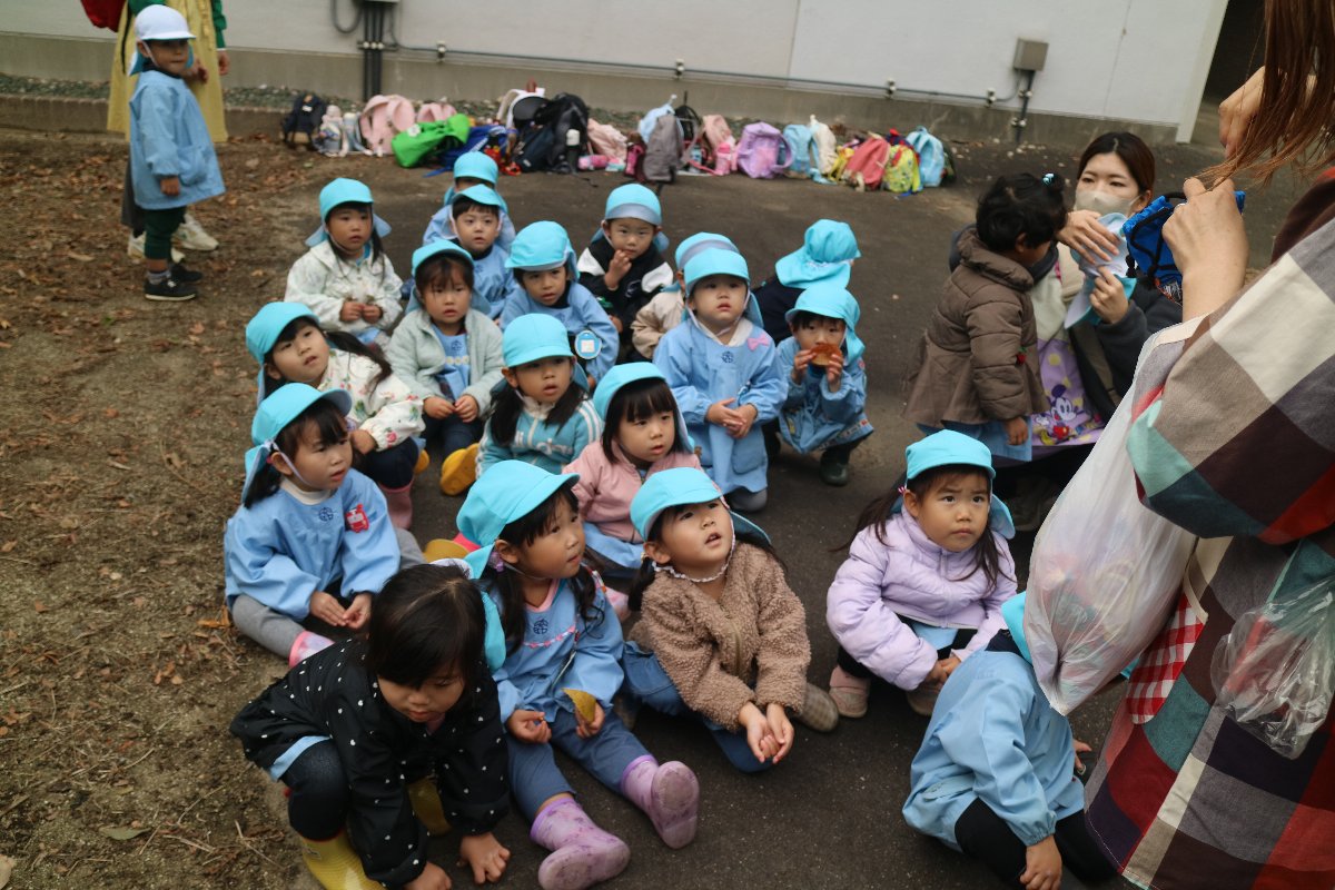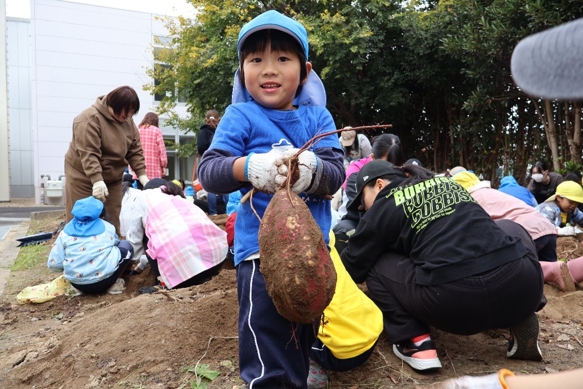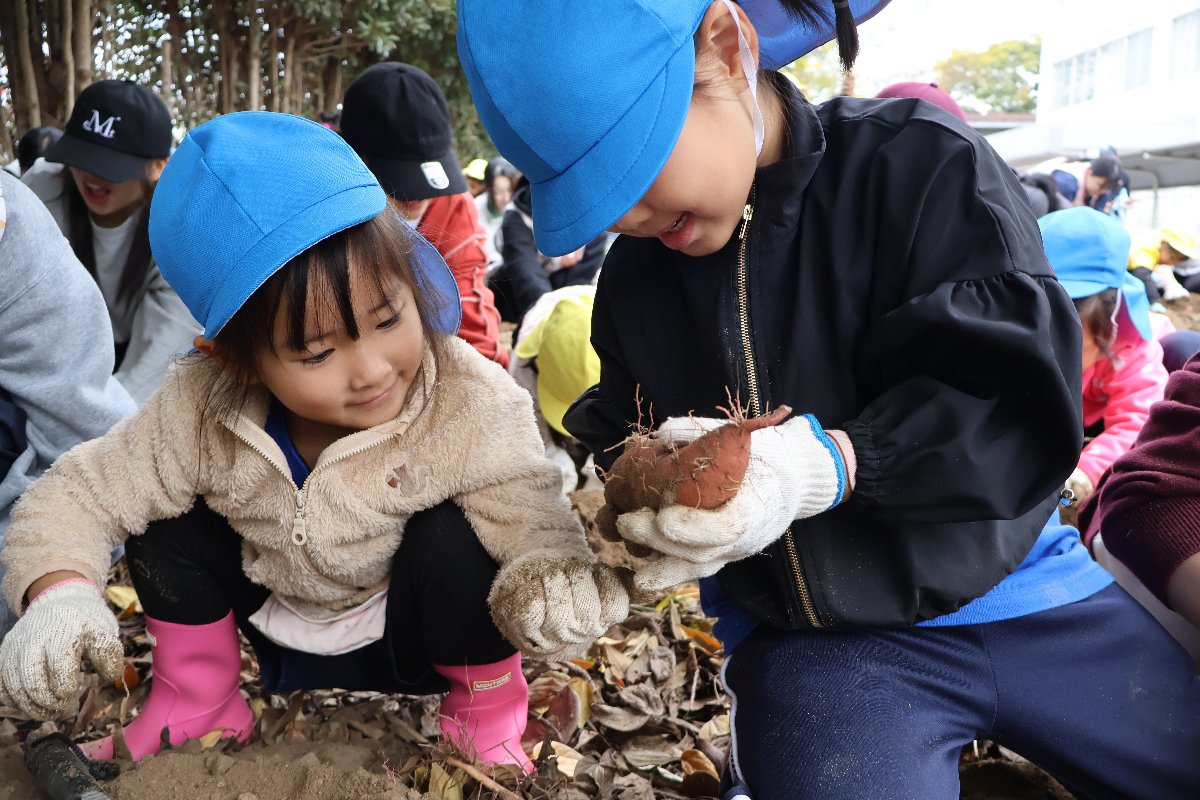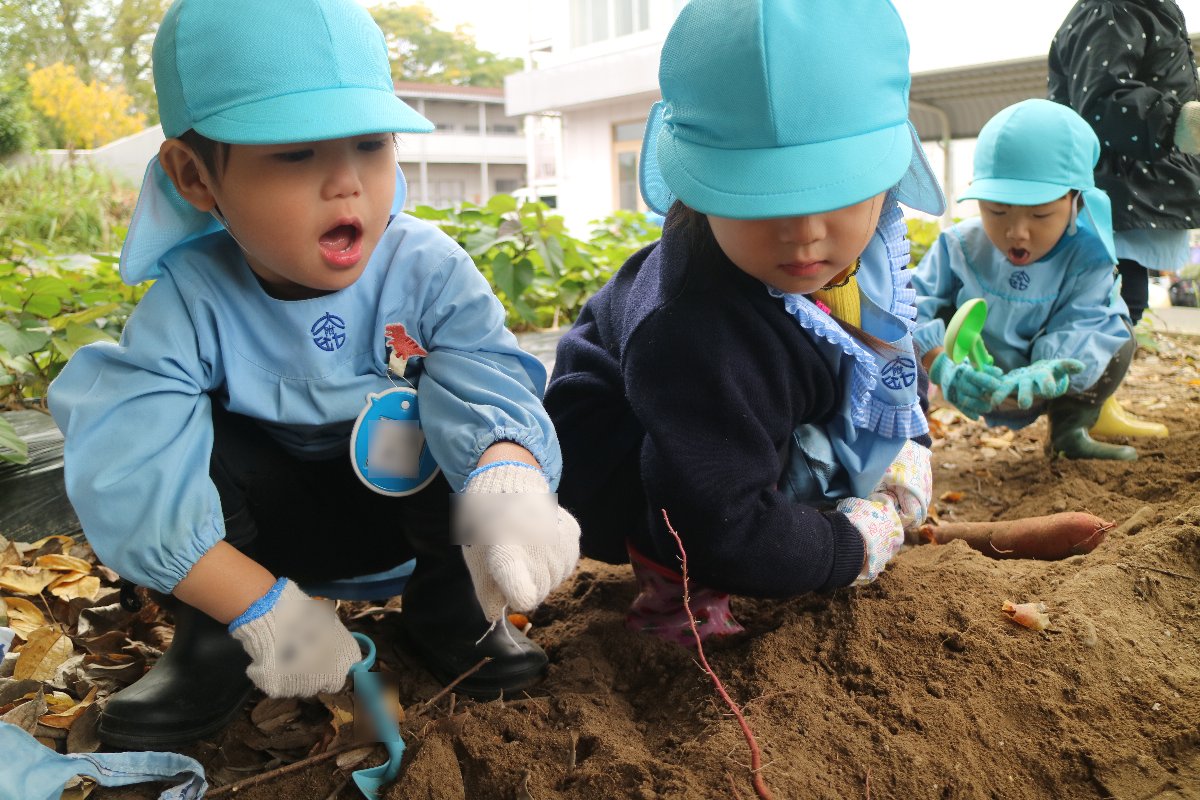 11月13日(水)、愛知学泉短期大学幼児教育学科1年生と愛知学泉短期大学附属幼稚園年中さん、満3歳児さんが、短大のキャンパス内にある畑でいも掘りを楽しみました。このおいもは5月に幼児教育学科の学生と年中さんが一緒に植えたおいもで、今日までの間、学生たちが大切に育ててくれていました。