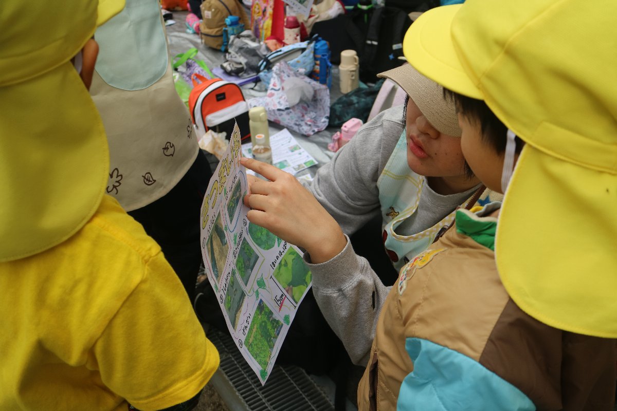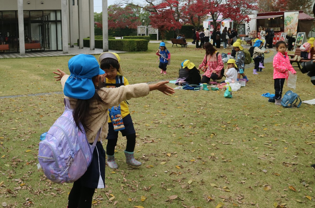 園児たちはこの後、キャンパス内の芝生でお弁当とおやつを食べ、落ち葉で遊んだり、どんぐりを拾いをしました。たくさんの秋にふれあえた1日でした。