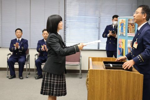 岡崎城西高校美術部が制作した消防職団員募集ポスターの取組みが高く評価され、11月19日(水)、岡崎市消防長より感謝状が授与されました。