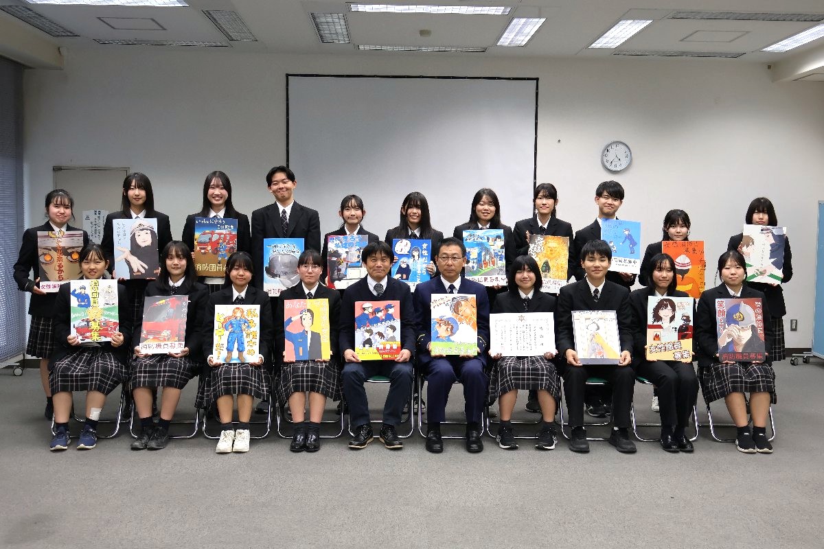 ポスターは職員募集広報、女性消防職員活躍推進、消防団募集広報の3種を制作。消防署の見学や署員の方のお話を聞かせていただくなど、地域の安全を守る消防の大切さをを学ぶ機会ともなりました。今後、一部の作品はポケットティッシュやカイロなどで配布され、広報活動に活用されるそうです。生徒たちは「自分たちの作品が地域に役立つことがうれしい」「今後も地域に貢献できる活動を続けたい」と語っていました。