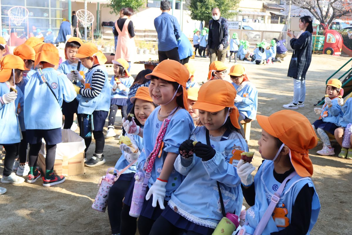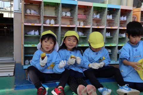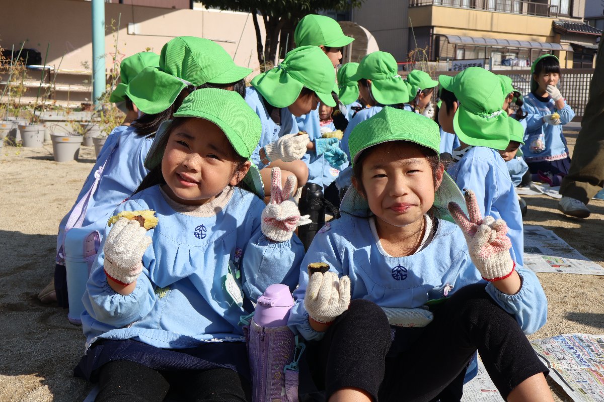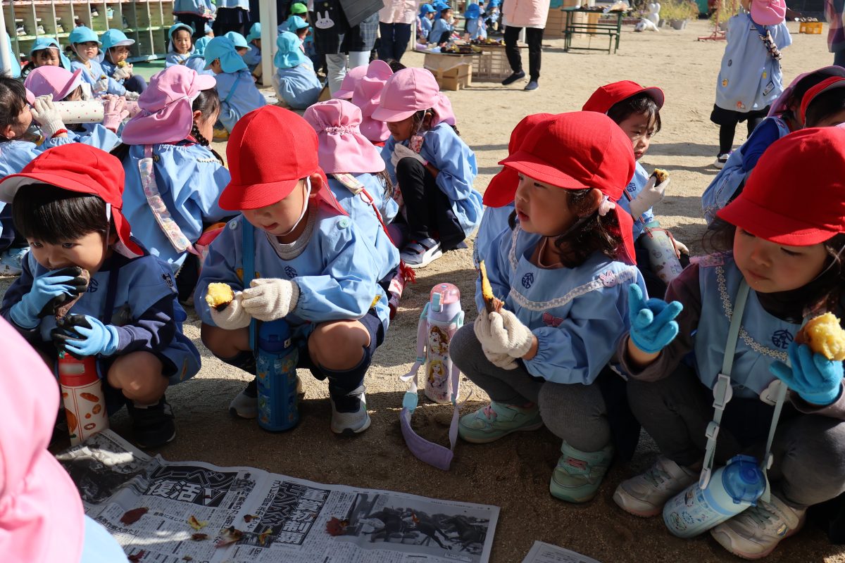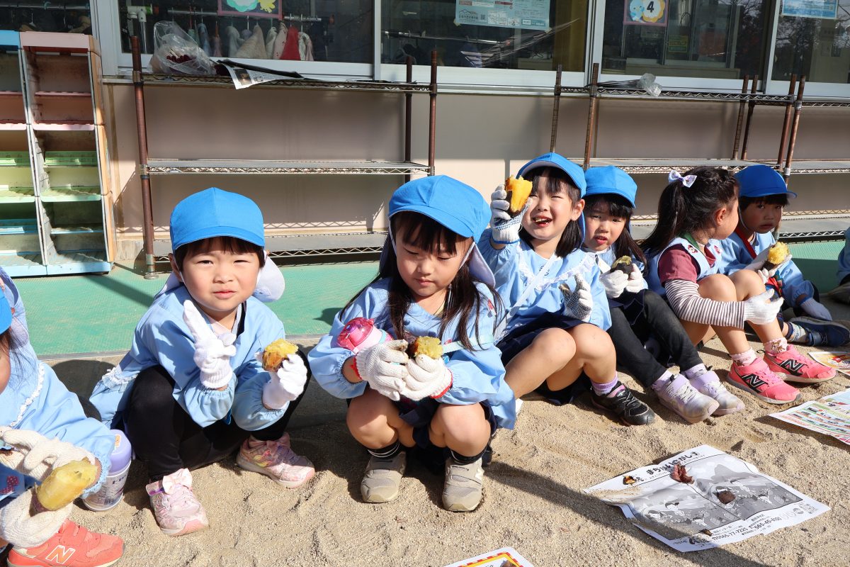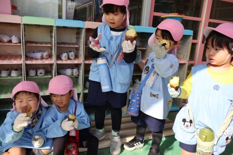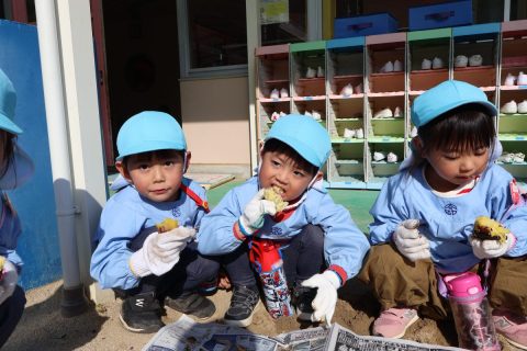 焼きあがったおいもを見て、子どもたちは「いい匂いがするね」「早く食べたい!」とうれしそう。一人ずつおいもを受け取り、友だちや先生と笑顔を交わしながら、ほくほくのお芋をほおばります。「おいしいね」と声をそろえる姿が印象的でした。