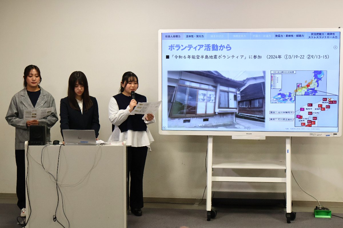 審査の結果、大学はこどもの生活学科「能登の学びを地域の力に ー復興支援からつながる防災活動の実践ー」、短大は生活デザイン総合学科「映像の力で『伝わらない』を『伝わる』に変える ~魅力を学内そして地域に~」が最優秀賞に選ばれました。