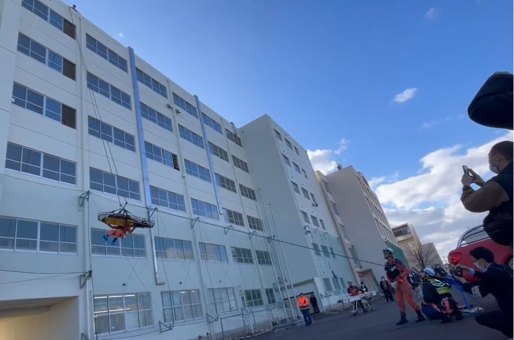 今回の訓練は、初めて市の消防本部と連携したもので、「高校で火災が発生し、偶然居合わせた消防士が避難を指揮する」という設定で企画。火災報知器が鳴ったら即避難ではなく、通報位置や出火場所の確認など教職員がどう動くか、消防隊が到着するまでの初動についても実践しました。生徒たちの避難は消防署の方の指示にしたがって開始。グラウンドへの避難完了後、逃げ遅れた人たちをどのように救助するか、消防隊の降下訓練を見せていただきました。訓練後は消防署の方と、コーディネーター佐野氏(自分でやる防災研究・普及所 所長)による対談形式の事後学習を実施。オンライン配信を通じて全教室をつなぎ、訓練中の指示の背景にある専門的な根拠が解説されました。