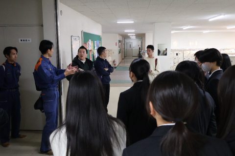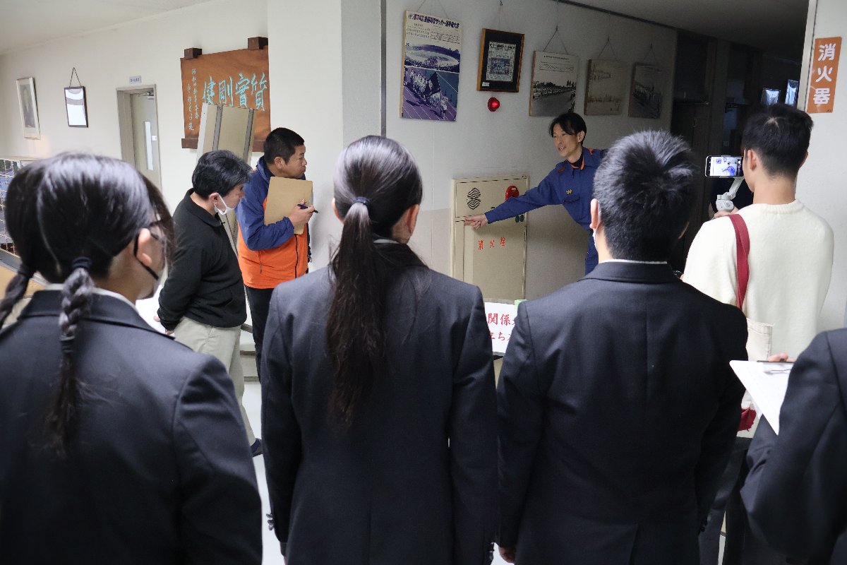 別の日には、訓練に先立ち、ごく一部の生徒と教員が事前に消防署の方と校内を歩き、防火設備の意味や使い方などの説明を受けました。