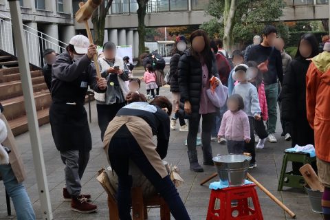 当日は、地域の大人と子どもが協力して餅つきが行われ、来校者につきたてのお餅が振る舞われました。お餅ができるまでの過程を通じて食育に触れるとともに、災害時に声を掛け合い、支え合える関係づくりの大切さを再確認する機会となりました。