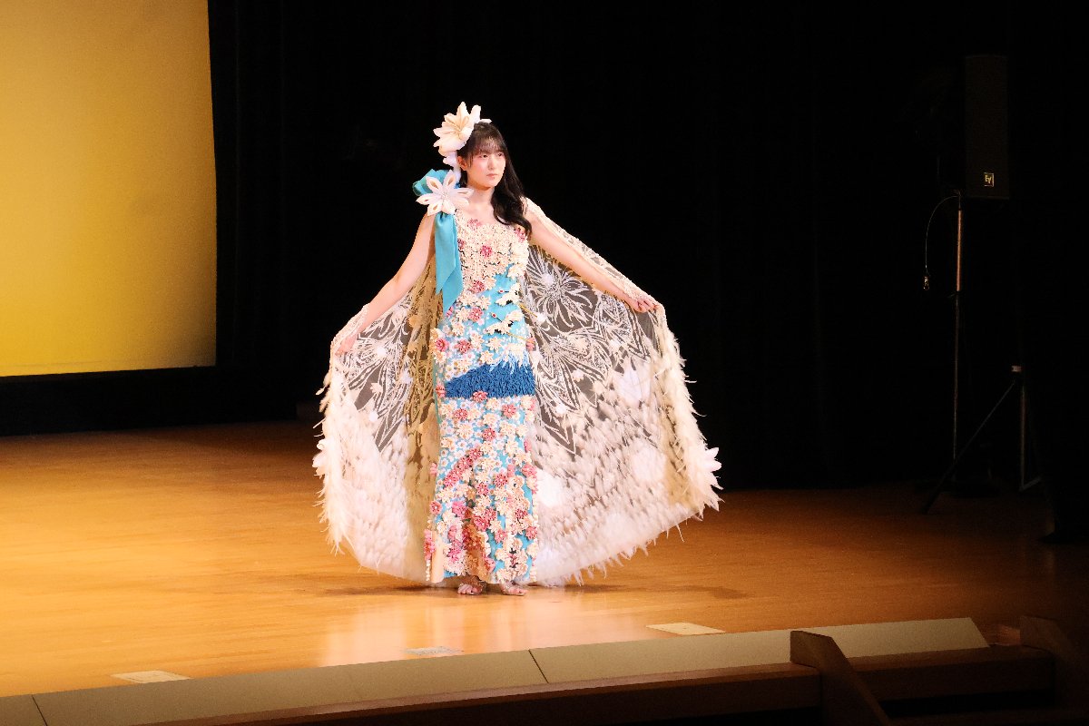ショーの幕開けを華やかに飾ったのは、昨年10月開催の「長浜kimono AWARDS 2025」で浜ちりめん部門グランプリを受賞した作品です。見事2年連続のグランプリという快挙を達成しました。受賞メンバーの柴田華帆さん、米谷陽南さん、清水はなさんの3名は、杉浦菜穂子先生の指導のもと、前期から丁寧に制作を重ね、伝統素材・浜ちりめんの魅力を現代的に表現した優雅なドレスを完成させました。繊細な手仕事と美しい色彩感覚が光る作品は、観客の心を惹きつけました。