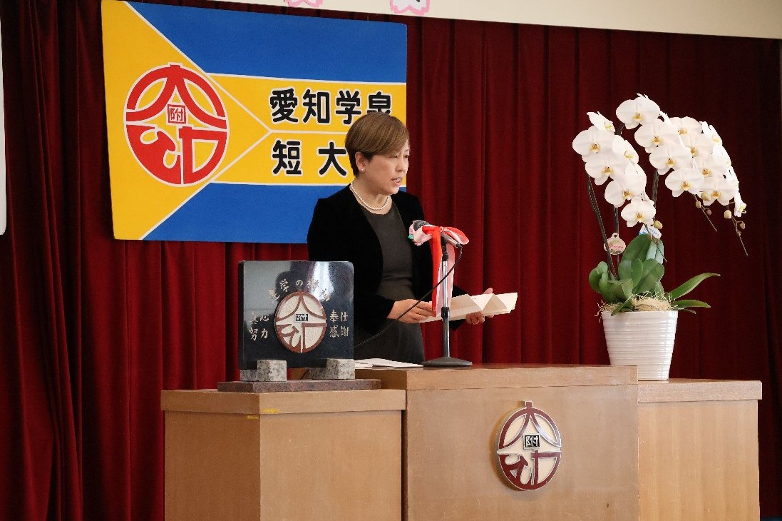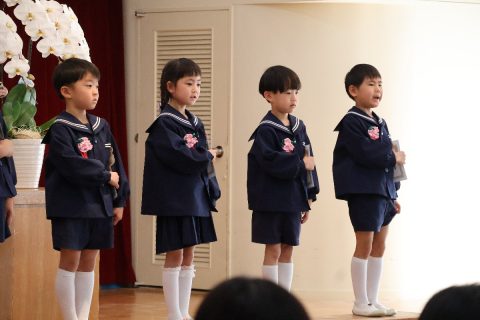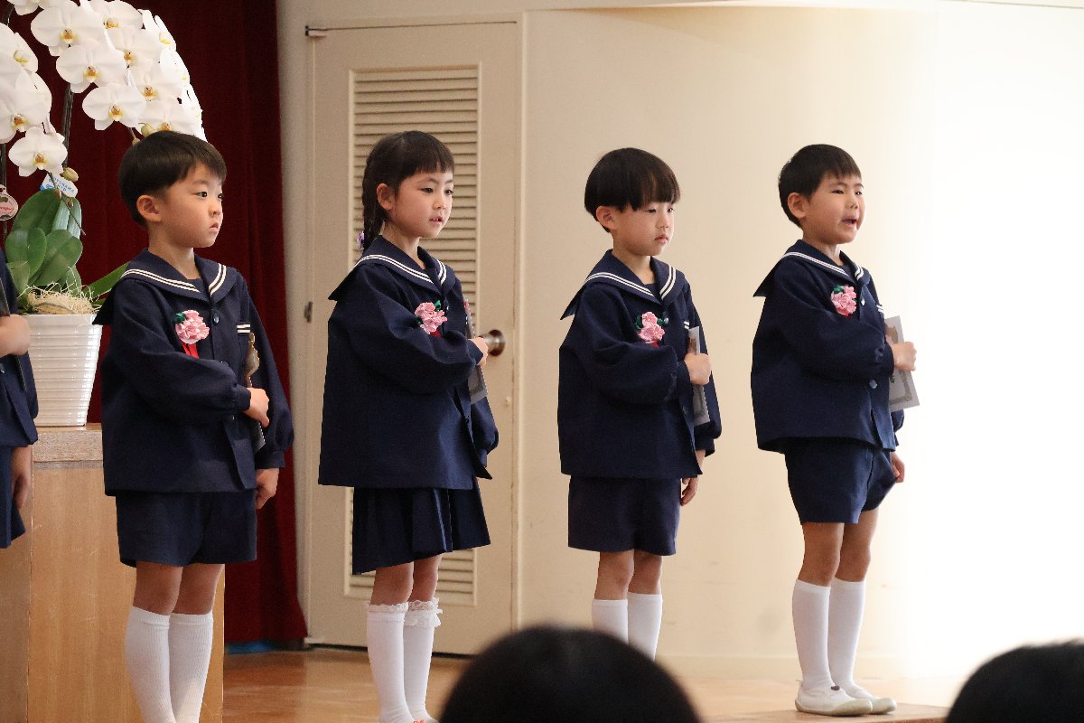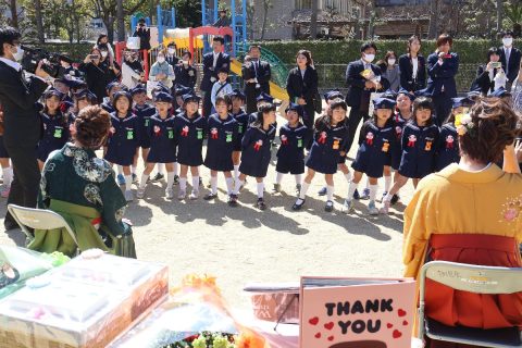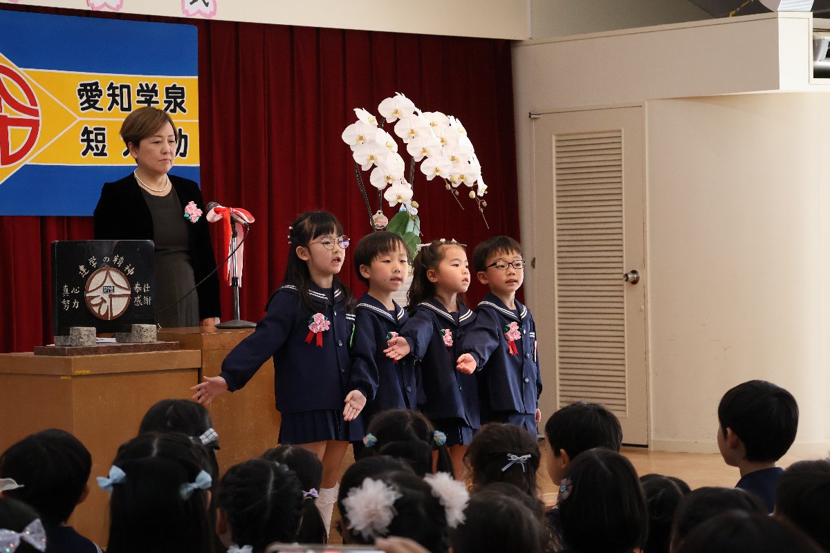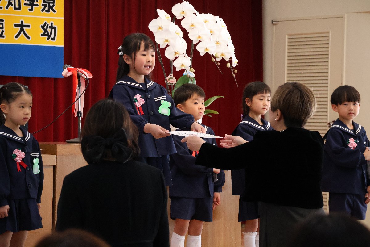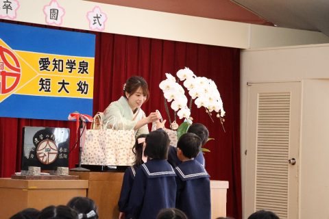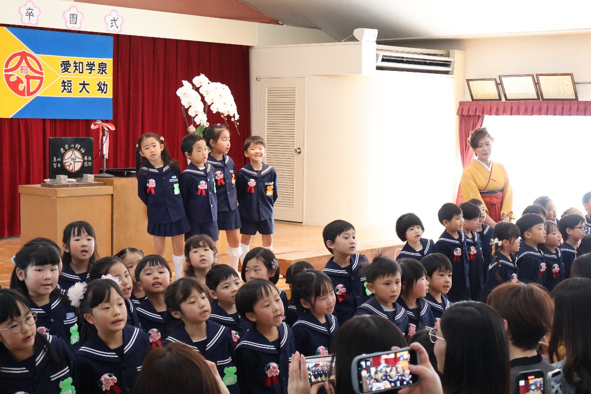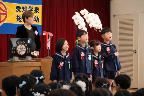 3月14日(土)、愛知学泉短期大学附属幼稚園の卒園式が行われました。毎日通った園を巣立つ園児たちは、お父さん、お母さんと晴れやかな表情で登園。お母さん方が心をこめて作ったコサージュを担任の先生に「おめでとうございます」の言葉とともに胸につけてもらい、素敵な笑顔を見せていました。式では、一人ひとりが園長先生から修了証書を受け取り、将来の夢を発表しました。お別れのことばや歌を大きな声で届ける姿は、幼稚園での成長を感じさせ、とても頼もしく思えました。