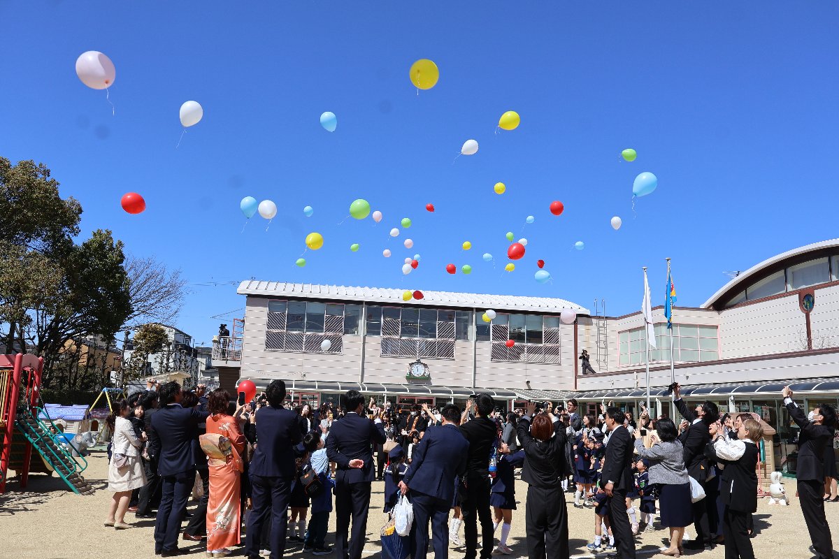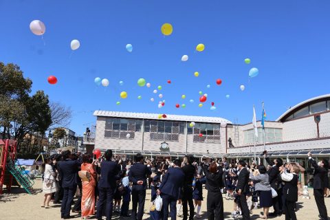 卒園式の後は、園庭でのバルーンリリース。雲ひとつない青空に色とりどりの風船が舞い上がると、子どもたちは手を振りながら見送りました。 幼稚園でのたくさんの思い出を胸に、小学校に行ってもがんばってください。ご卒園おめでとうございます!